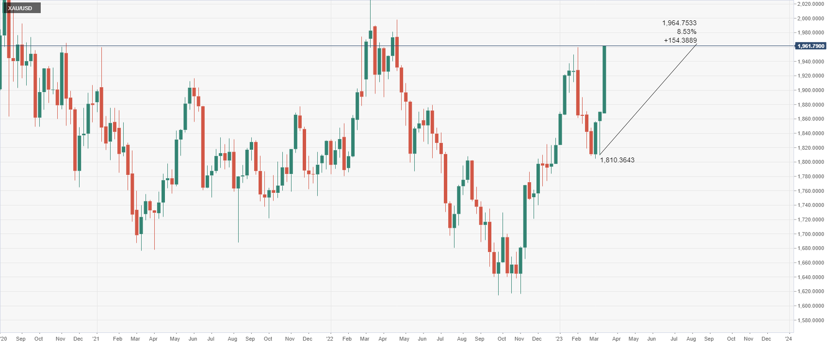 上周五,在非农就业报告发布后,金价加速上涨,然后在矽谷银行(SVB)倒闭后进一步加速。持续的动盪削弱了各国央行收紧政策的预期,压低了政府债券收益率。