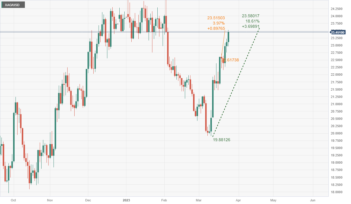 自本周初以来,白银/美元已经上涨了4%,从3月10日的低点𫔭始,几乎上涨了20%。价格正在测试一个相关的技术区域,在23.50美元上方的盘整可能会保持更多涨幅的道路畅通,即使技术指标显示极端超𧹒的情况。