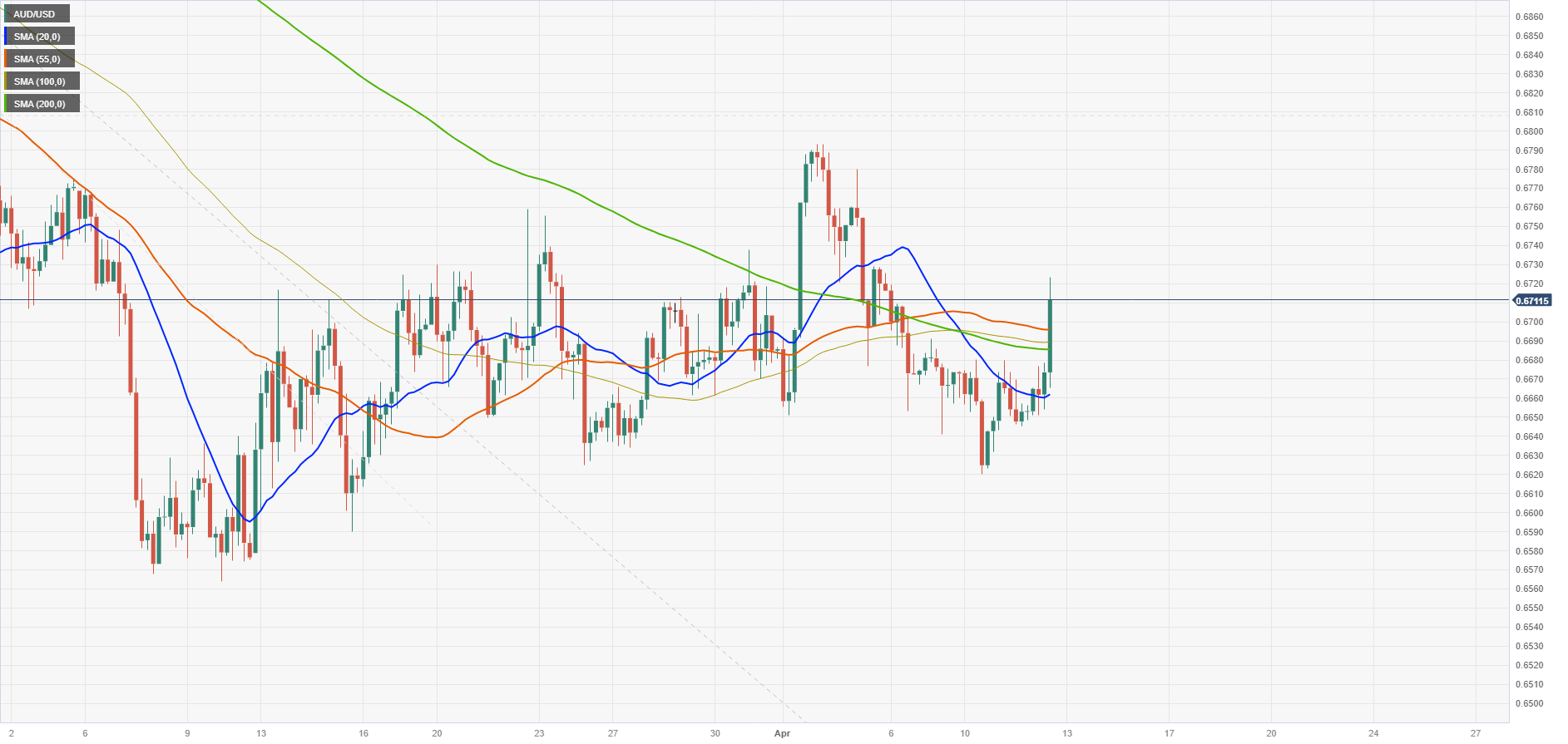 澳元/美元重新夺回0.6700区域,并攀升至0.6723。它保持坚挺,价格高于四小时图中的关键移动平均缐。