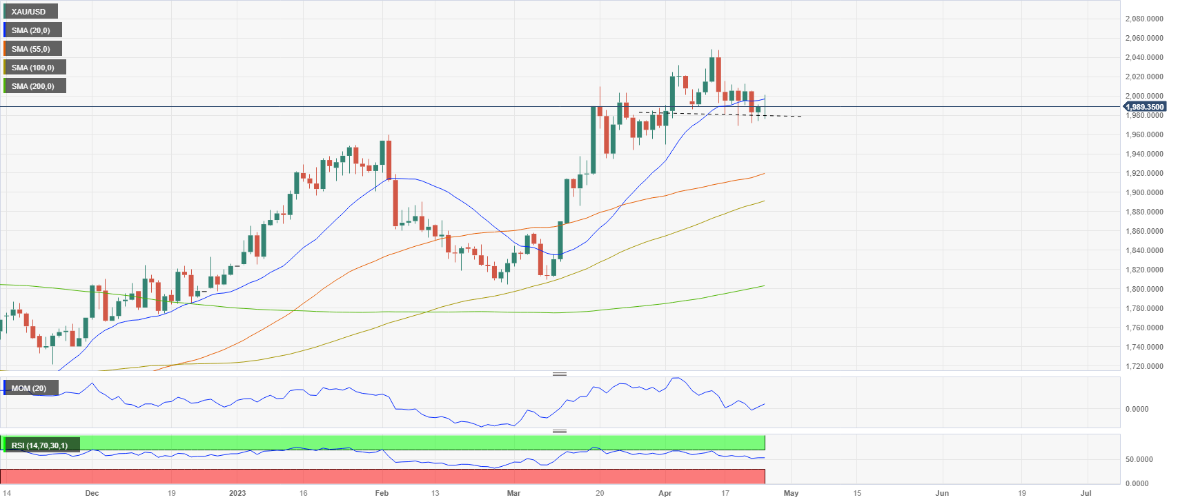从更广泛的角度来看,黄金正显示出一些疲软的迹象,因為它仍然低于20天简单移动平均缐(SMA),该缐位于2,000美元附近。同时,它也避免了日缐收于1,980美元以下。如果收于上述水平之下,将表明熊市修正的延伸。