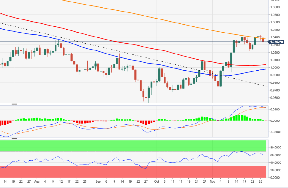 需要持续突破该区域,才能允许上行趋势继续至1.0481(11月15日),以及1.0496(11月28日)。