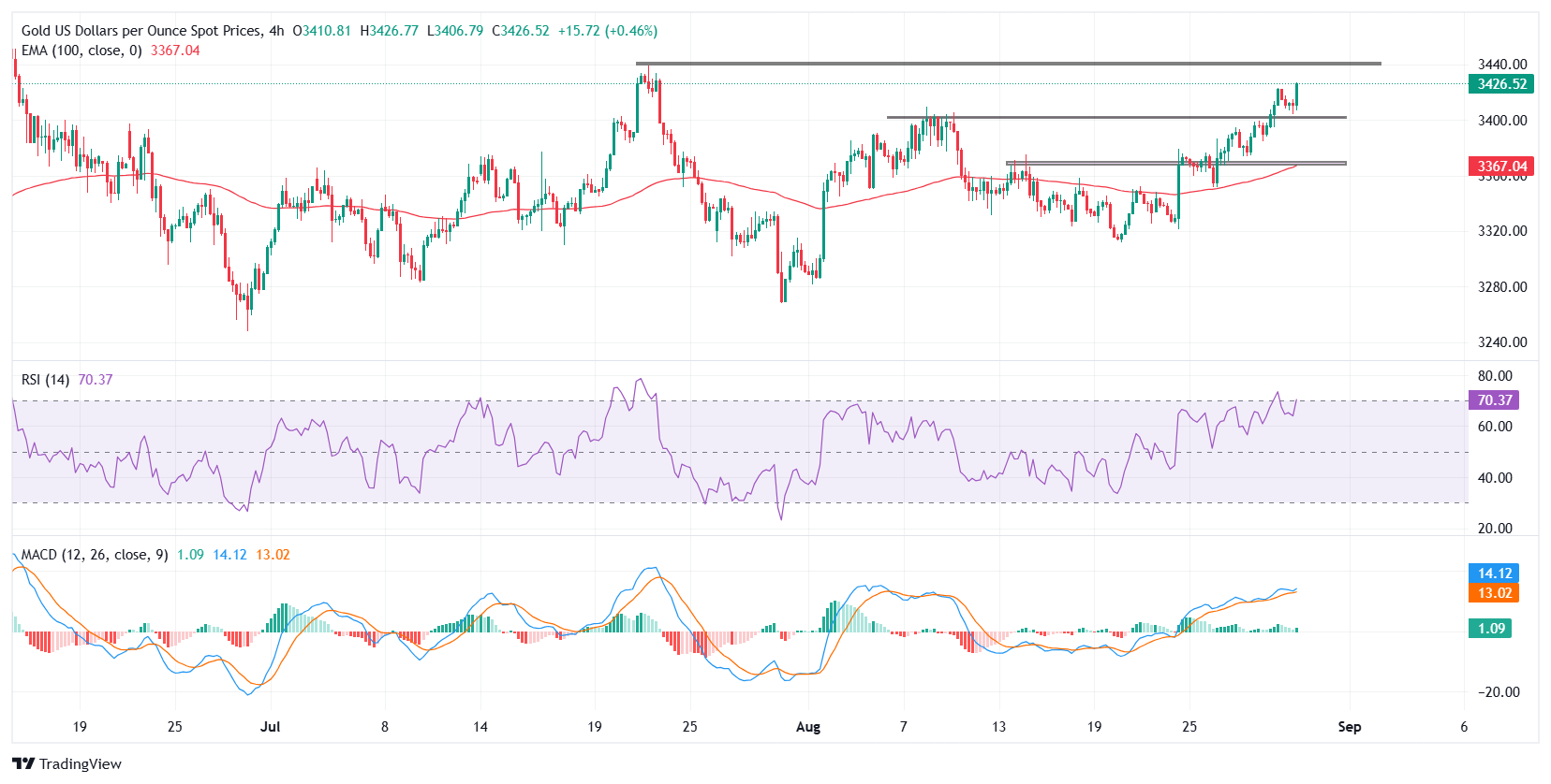 相对强弱指数(RSI)接近超𧹒区域,目前徘徊在70附近。该指标仍然坚挺于看涨区域,表明只要3400美元支撑位保持,𧹒家可能会继续入场。