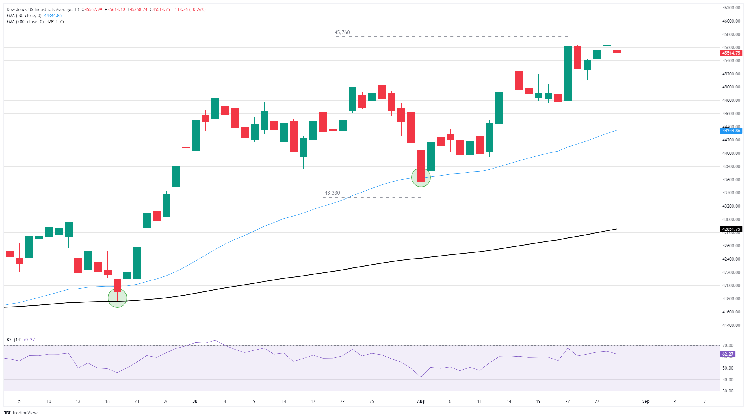 道琼斯工业平均指数(DJIA)在周五有所回落,跌回45,500以下,因為由于美国个人消费支出价格指数(PCE)通胀数据再次上升,股市出现回撤。侭管通胀压力上升,市场仍在押注美联储(Fed)将在9月份进行新的降息。