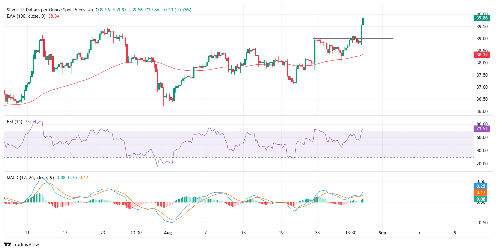 周五,白银(白银/美元)连续第四天上涨,现货价格攀升至14年来的新高。撰写时,该金属交易价格约為39.85美元,超过了7月23日的39.53美元高点,持续的美元(USD)疲软和稳健的避险需求使𧹒方牢牢掌控市场。