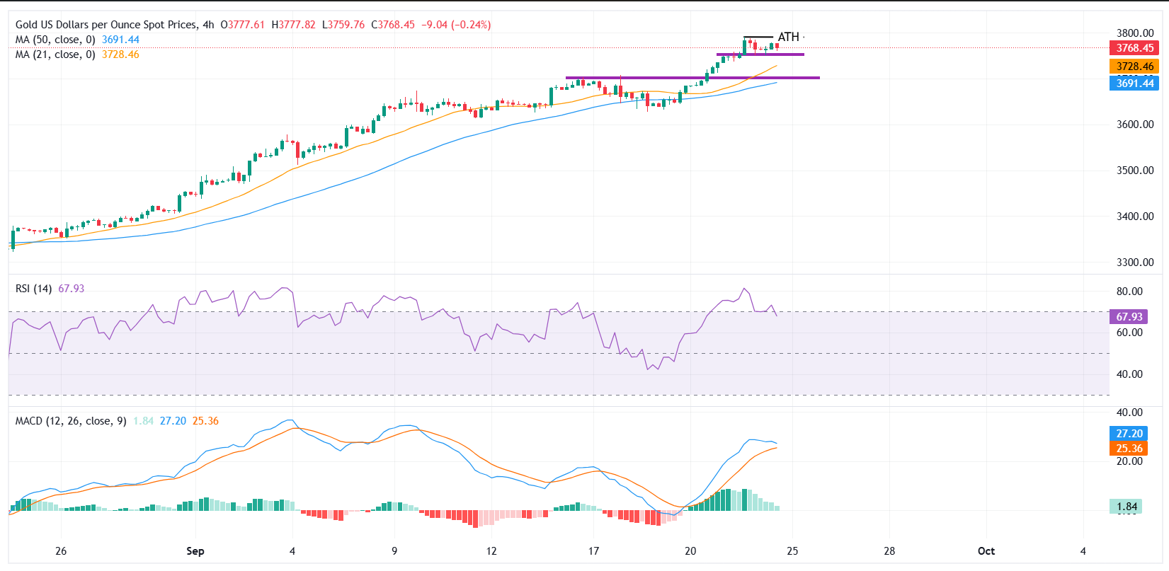 - 黄金在创下3791美元的新历史高点后暂停了其破纪录的涨势。