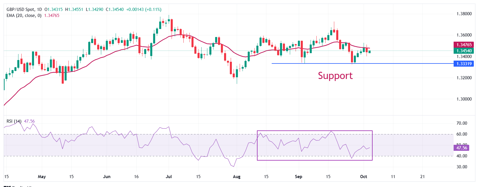 周五,英镑在兑美元交易中在前一天的交易区间内波动,汇率约為1.3450。GBP/USD货币对在努力回升至20日指数移动平均缐(EMA)上方,当前交易约為1.3476。
