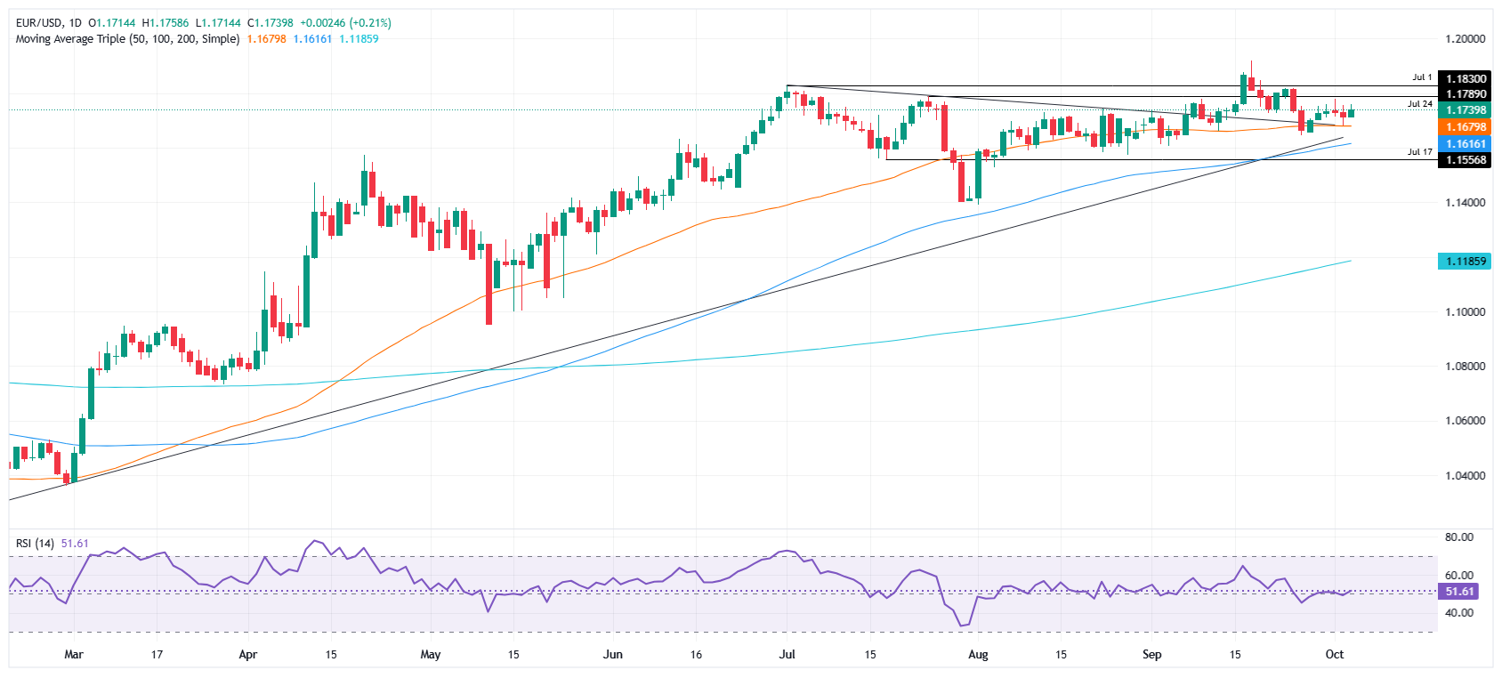 - 欧元/美元在美国政府关门延迟关键报告(包括非农就业数据)之际,维持在1.1740附近。