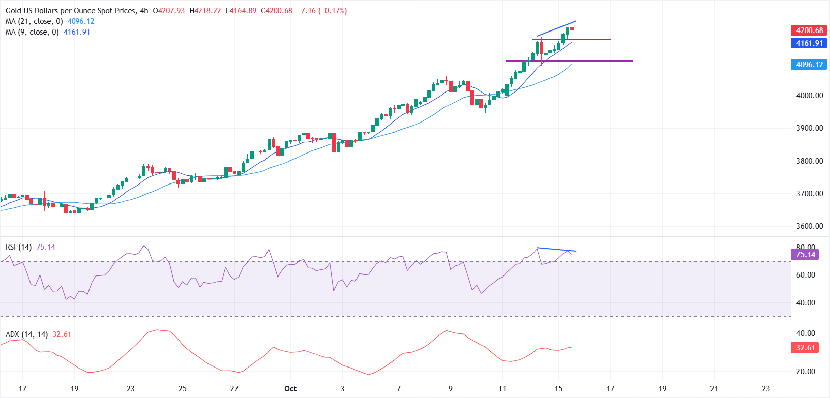 在4小时图上,即时支撑位在4180-4160美元区间,与21期简单移动平均缐(SMA)密切对齐。更深的回调可能在4100美元附近找到额外的𧹒入兴趣,50-SMA提供进一步的动态支撑。任何向这些水平的回调都可能吸引新的𧹒入,保持整体上升趋势不变。