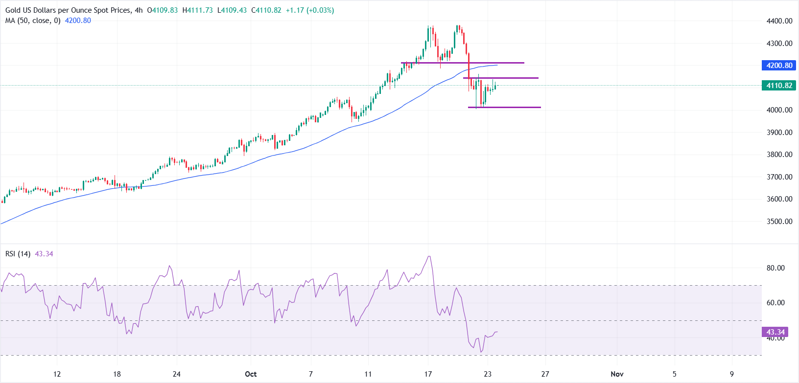 黄金(黄金/美元)周四在一个窄幅区间内波动,经过从历史高点的急剧回调后进行盘整。撰写时,黄金/美元在 4,150 美元附近交易,经过两天的下跌后略微上涨,因為在经济不安和地缘政治紧张局势交织的背景下,避险需求仍然得到支撑。