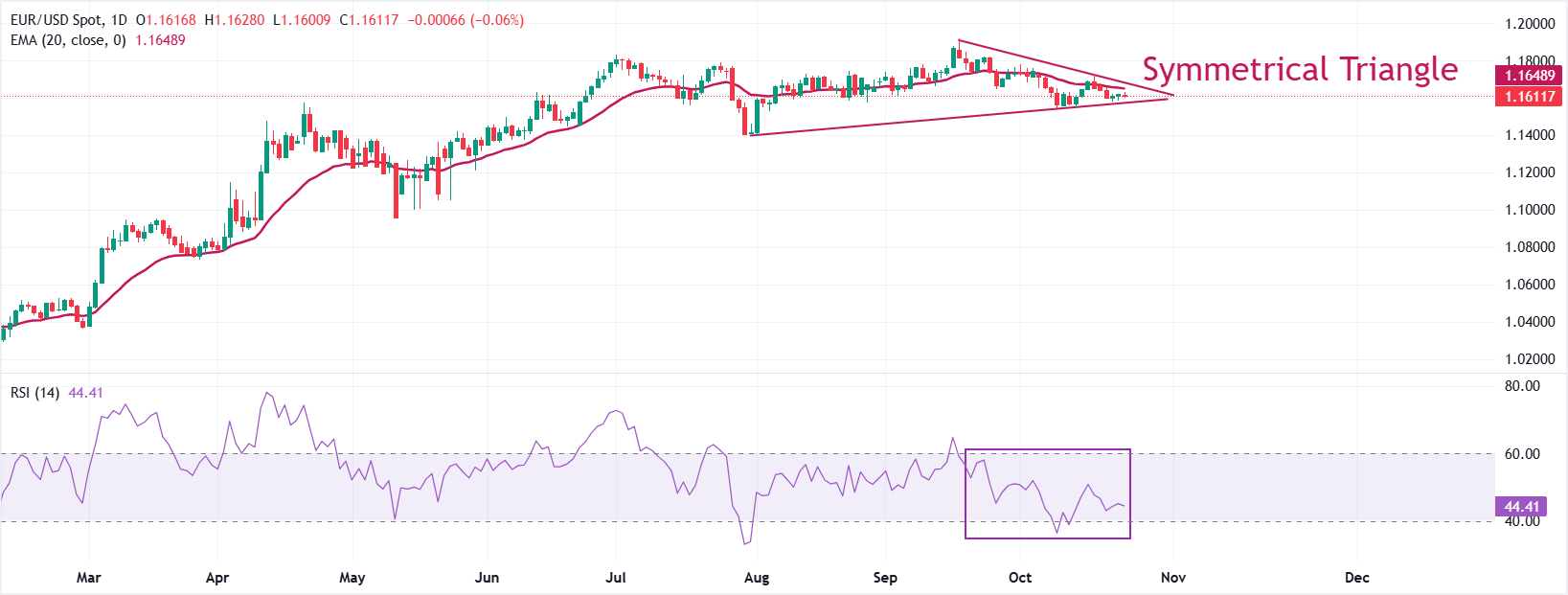 在周五的欧洲交易时段末,欧元/美元在略高于1.1600的狭窄区间内交易。该主要货币对在对称三角形图表模式形成中表现出更广泛的横盘趋势。