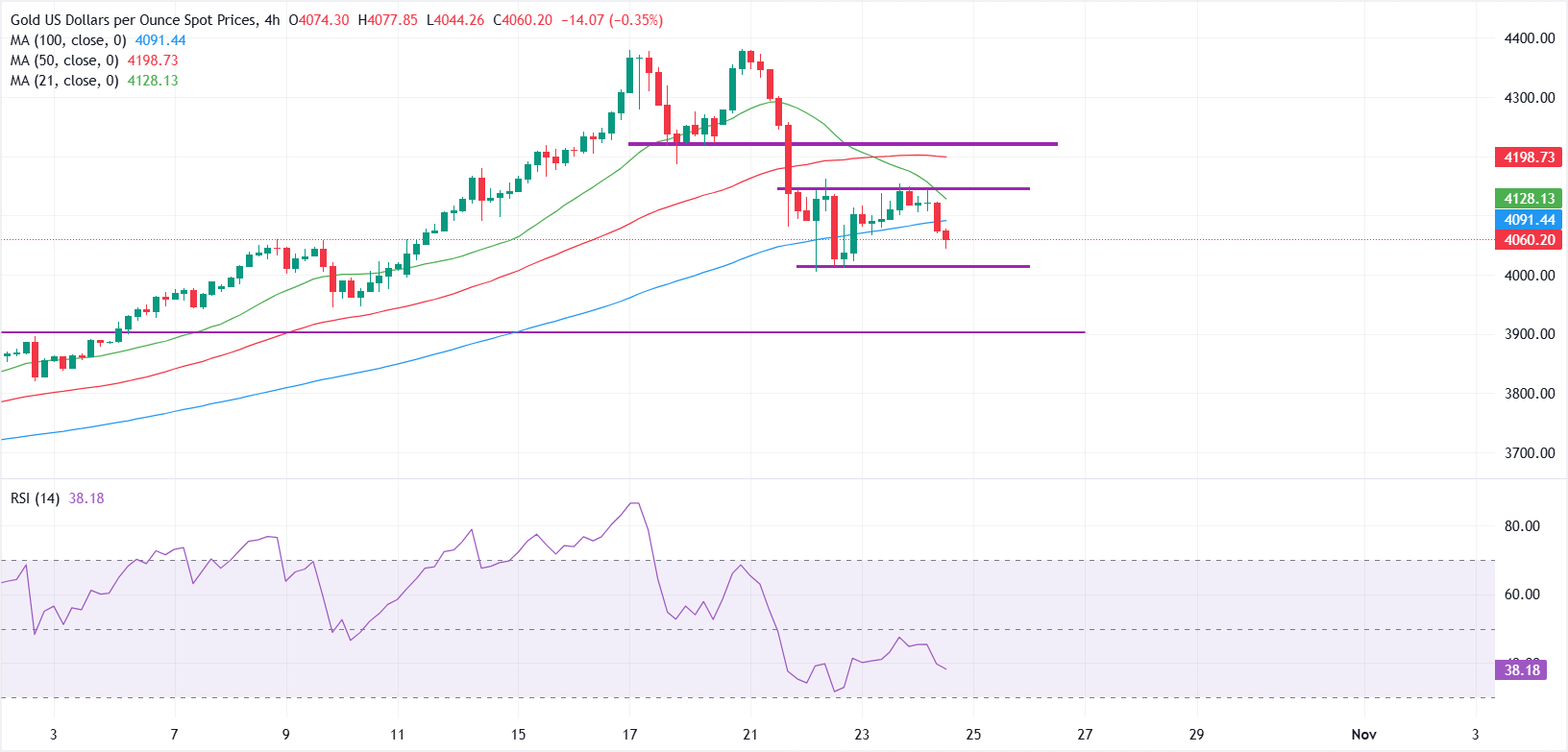 技术分析:XAU/USD走弱,卖方捍卫4150美元阻力区