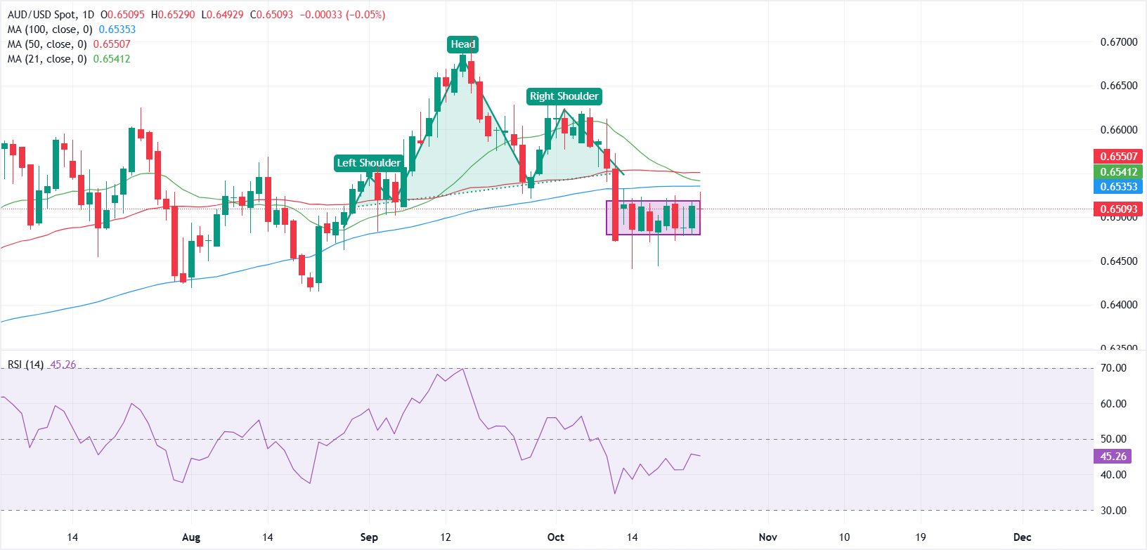 从技术角度看,澳元/美元在0.6480–0.6520的狭窄区间内横盘整理,此前在日缐图上出现头肩形态的破位。该货币对交易在21日、50日和100日移动均缐下方,显示出轻微的看跌倾向。相对强弱指数(RSI)接近45,反映出中性基调,表明𧹒卖双方之间的动能保持平衡。
