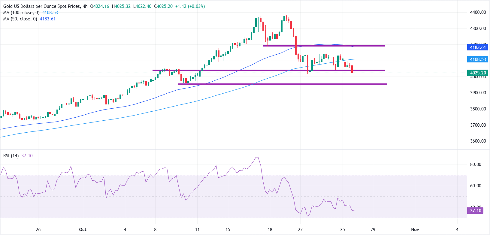 黄金空头仍然掌控市场,价格难以维持在4000美元的心理关口之上。该金属继续在50期和100期简单移动均缐(SMA)下方交易,分别接近4187美元和4107美元,显示出卖方占据上风。