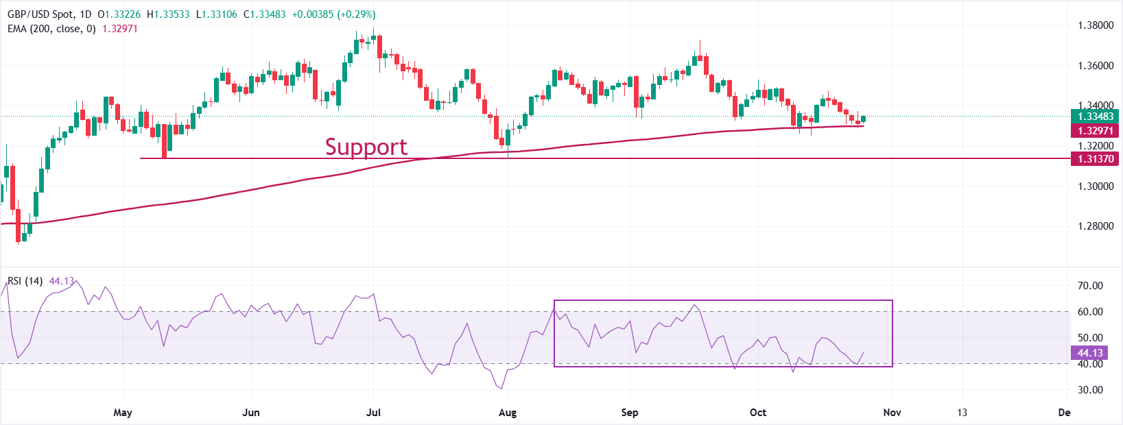英镑在周一接近12日低点1.3310时,难以对美元取得进展。英镑/美元的整体趋势不确定,徘徊在200日指数移动平均缐(EMA)附近,交易价格约為1.3300。