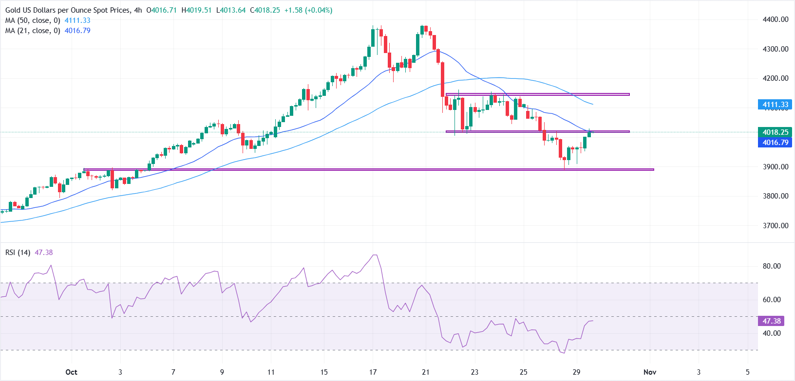 截至发稿时,XAU/USD交易在4020美元左右,上涨超过1.5%,结束了连续三天的下跌趋势,投资者重新回归避险资产。