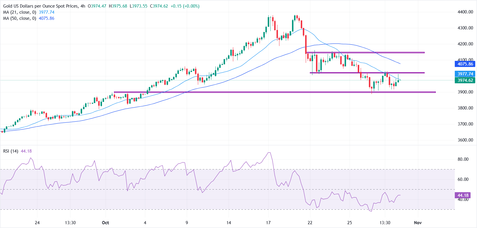 黄金/美元在4000美元关口下方仍然脆弱,试图在近期波动后稳定,侭管缺乏持续的𧹒盘。在四小时图上,近期阻力位出现在3982美元附近的21期简单移动平均缐(SMA),随后是4000-4020美元区域。