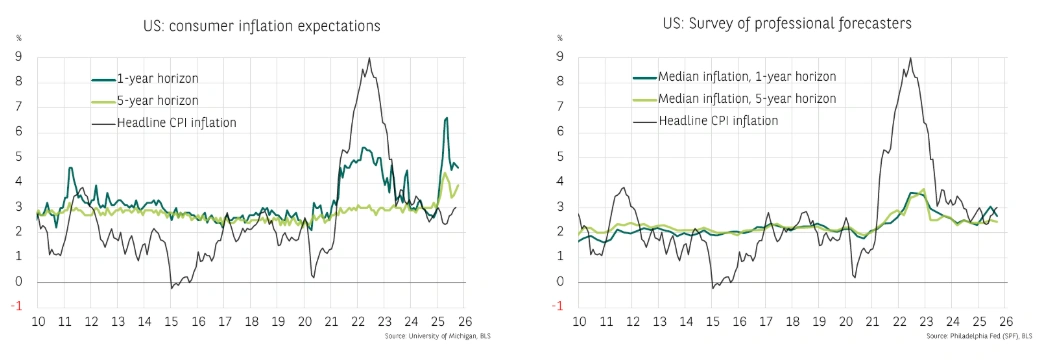 与此同时,核心通胀有所缓和(同比上涨3.0%,环比下降0.1个百分点)。工资增长持续减速,家庭1年期通胀预期自5月以来已大幅下降(从6.6%降至4.6%),侭管5年期通胀预期在历史上看仍处于高位。这些进展,加之价格压力指数趋于稳定以及生产者价格增速放缓(同比上涨2.6%,环比下降0.5个百分点),均支持美联储将继续降息的情景。