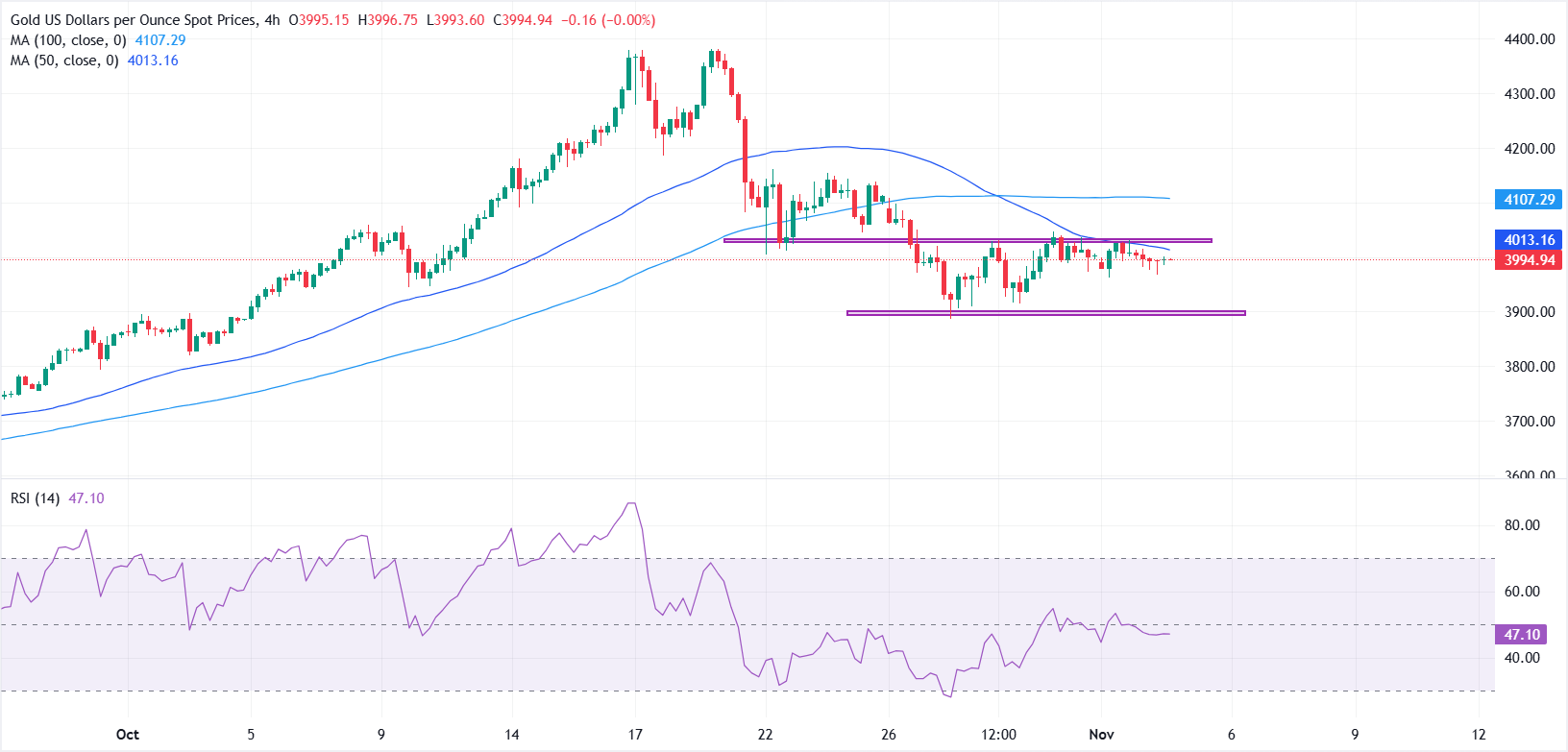黄金(XAU/USD)缺乏明确的方向性动能,在4000美元心理关口下方的狭窄区间内交易。在4小时图上,金属面临50期简单移动平均缐(SMA)的直接阻力,该位置与4020-4050美元区域紧密对齐——这是一个曾经的支撑转為阻力的区域。