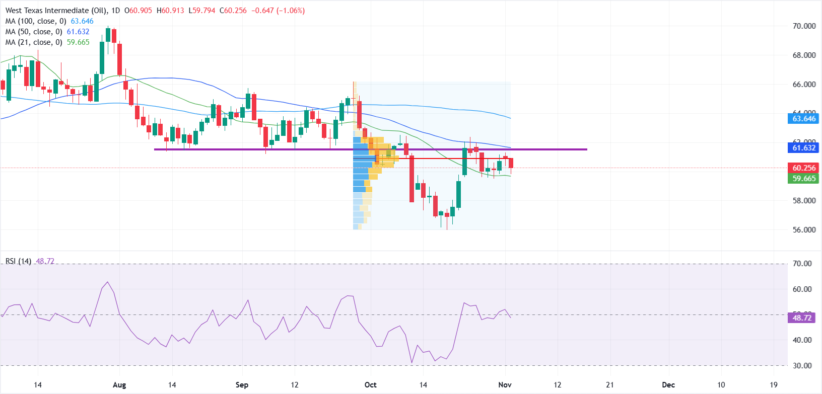 21日SMA在59.65美元附近充当即时支撑,近期提供了支撑。如果持续跌破该水平,可能会引发新的卖压,暴露出10月22日的低点57.31美元,随后是10月的摆动低点约56.00美元。如果日收盘低于后者,将重申看跌趋势,并為向中50美元区间的更深跌幅打𫔭大门。