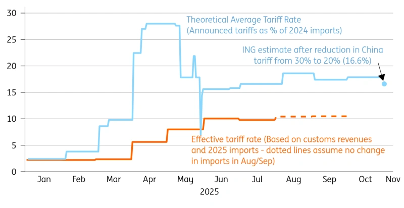 平均关税率由耶鲁大学计算,最新数据点為ING预估