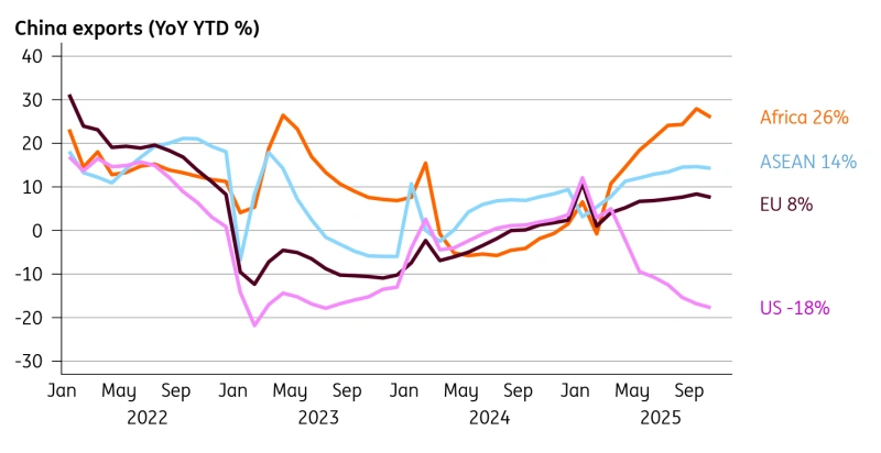 这让我回到了或许是2025年最具标誌性的图表,由我驻香港的同事Lynn Song提供。在今年前十个月,中国对美国的出口相较于去年同期下降了近20%。这完全被对其他地区的出口增长所抵消,侭管十月份我们看到了小幅下滑。