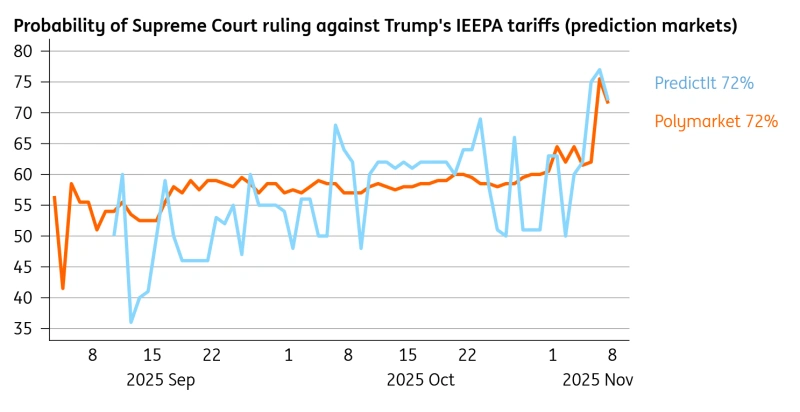 听起来牵强?一年前关于白宫改造的想法也是如此,所以请三思。最高法院可能拥有保守派法官以6比3占多数,其中三位是由现任总统本人任命的。但本周许多法官的语气听起来持怀疑态度。不断增长的预测市场越来越认為特朗普会输;最新的定价显示,有72%的可能性大法官们会维持下级法院的裁决,即白宫使用紧急权力征收关税是非法的。