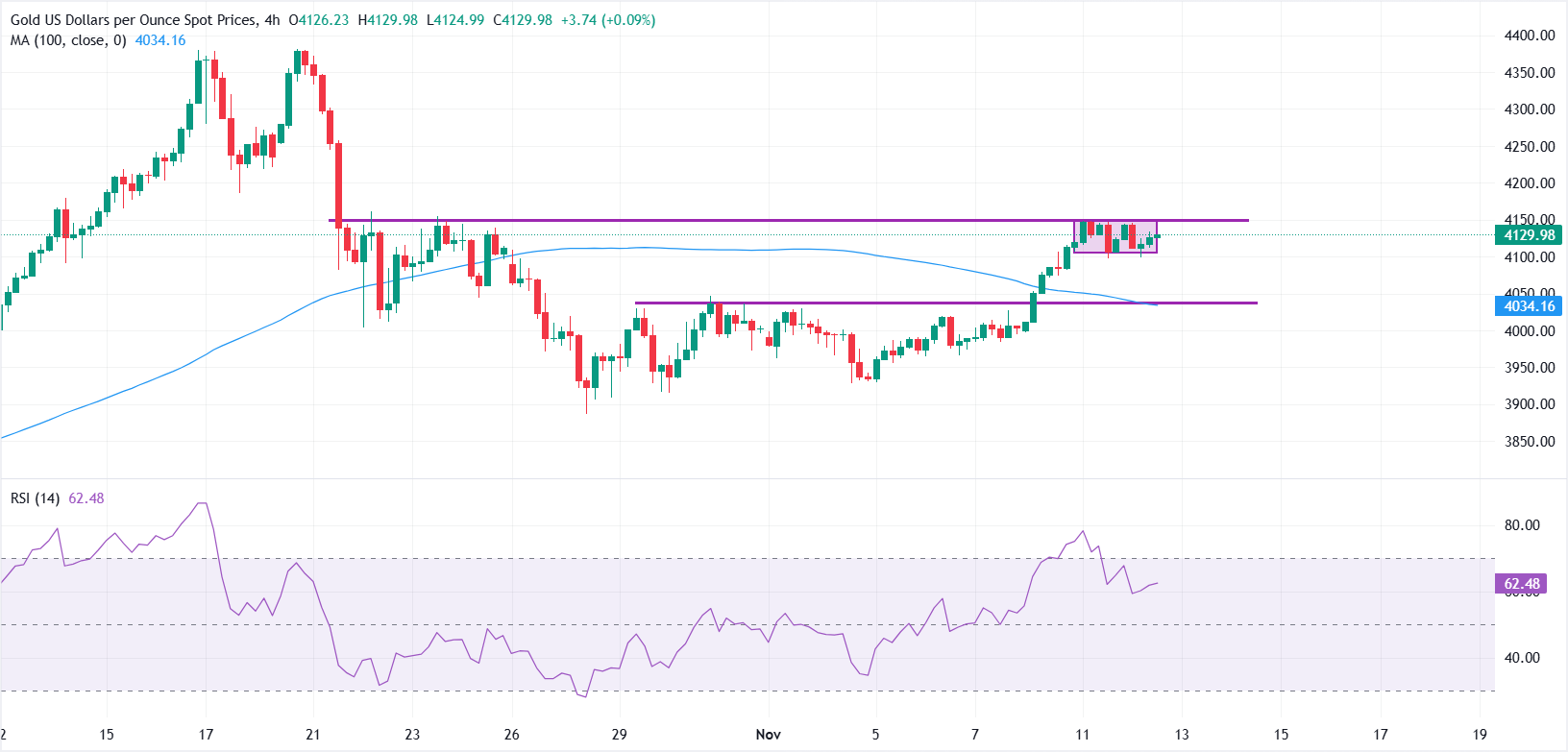黄金价格在4小时图上在一个狭窄的区间内盘整,4150美元作為即时阻力,4100美元提供近期支撑。价格走势反映出在4100美元附近的𧹒入兴趣,受到支持的宏观背景和技术结构的支撑。