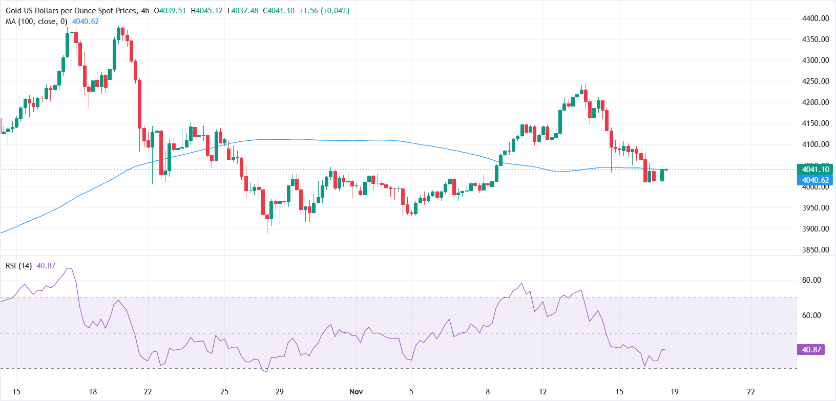 黄金(黄金/美元)在周二保持稳定,全球市场的避险情绪促使避险需求轻微回升。截至撰写时,黄金/美元交易在4040美元左右,在亚洲时段早些时候下滑至3998美元后小幅反弹。