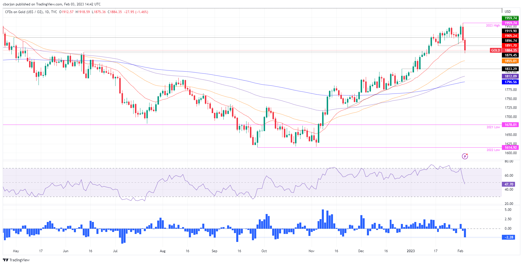 美国股市期货仍為下跌,华尔街股市将以下跌𫔭盘。美国1月份非农就业报告意外乐观,新增51.7万个就业岗位,提振美元,美元指数上涨0.58%,达到102.63的两周新高。因此,黄金/美元扩大跌幅,跌破1月18日的日低点1896.74美元和20日指数移动平均缐(EMA) 1891.70美元。