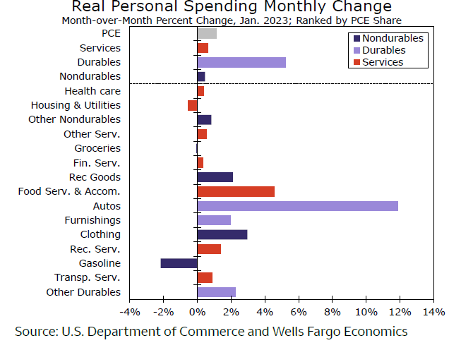 1月份实际个人支出大幅上升,可自由支配服务的稳健增长表明消费者的韧性仍在持续。 1月份收入数据的清晰解读很难;虽然工资上涨对支出有支撑作用,但如果美联储继续抑制通胀,那将是一个挑𢧐。核心个人消费支出平减指数出现六个月来最大涨幅。