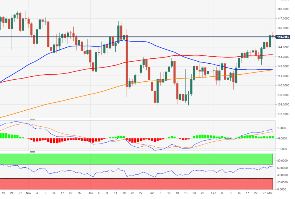 当前上行势头的延续面临2023年高点145.56(3月2日)的直接阻力。一旦该水平被突破,欧元/日元可能会挑𢧐2022年12月的高点148.40(2022年10月21日),然后是2022年12月的高点146.72(12月15日)。
