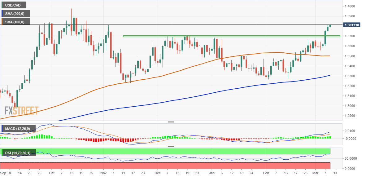 美元/加元在1.3785区域附近吸引了一些逢低𧹒盘,并在周四北美早盘期间攀升至10月21日以来的新高。该货币对目前在1.3800关口上方交易,似乎准备延续过去三周左右的上行轨迹。